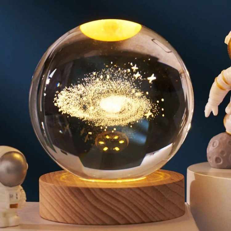 این چراغ خواب کریستالی به صورت سه بعدی و در طرح کهکشان تولید شده که باعث جذابیت بیشتر اتاق خواب شما می شود. جنس این گوی شیشه ای از کریستال فشرده می باشد و همچنین دارای یک پایه چوبی و کابل برق USB می باشد که امکان اتصال به لپ تاپ، کامپیوتر، پاور بانک و شارژ گوشی را فراهم میسازد. این محصول دکوری منحصر به فرد و شیک و همچنین یک هدیه جذاب و ماندگار برای هر شخصی می تواند باشد.